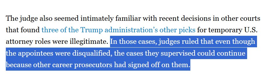 "In those cases, judges ruled that even though the appointees were disqualified, the cases they supervised could continue because other career prosecutors had signed off on them."