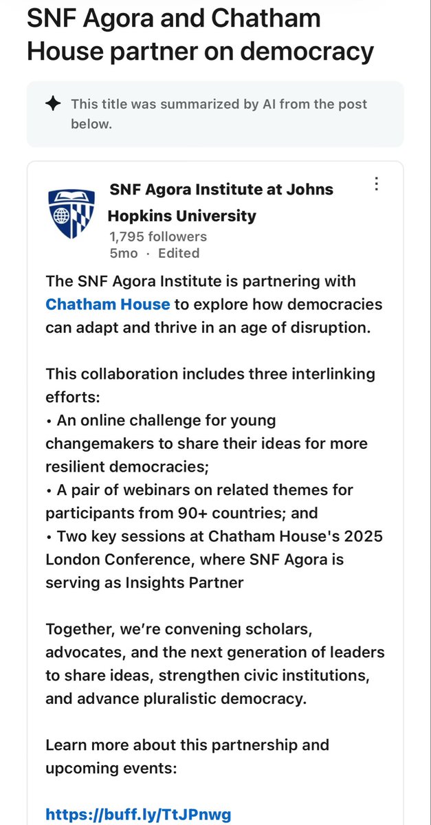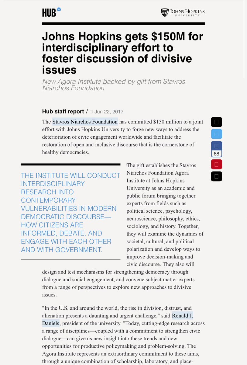 A Stavros Niarchos Foundation Agora (SNF Agora) was created at John Hopkins (Greek $$) in June 2017.