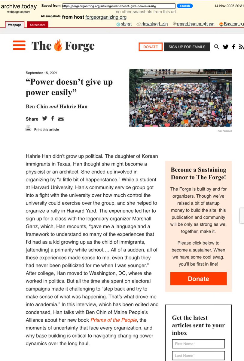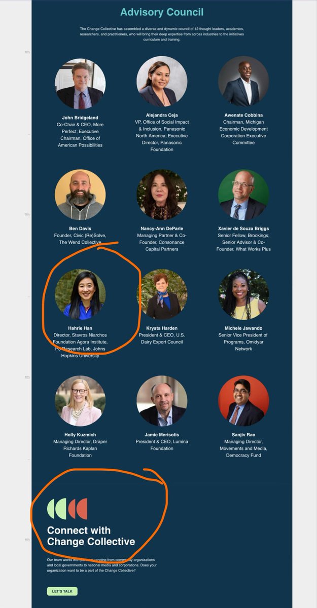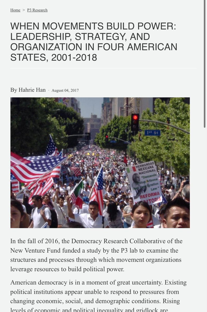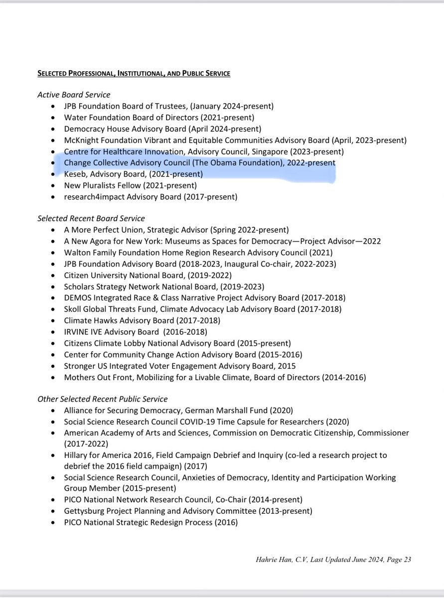 SNF Agora, directed by Hahrie Han concentrates on researching and teaching optimal protesting. Hahrie interacts with Obamas Marshall Gantz. And of course multiple folks there are connected to Obama including herself.