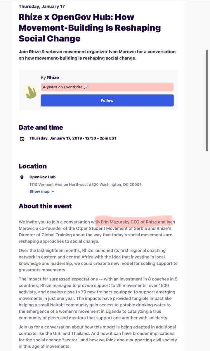 In 2016 Ivan Marovic designed and developed Global Coaching Corps for Rhize. The org that the Obama Fndn’s Global Network lead worked at. And the same org showing up at Open Government Hub events.