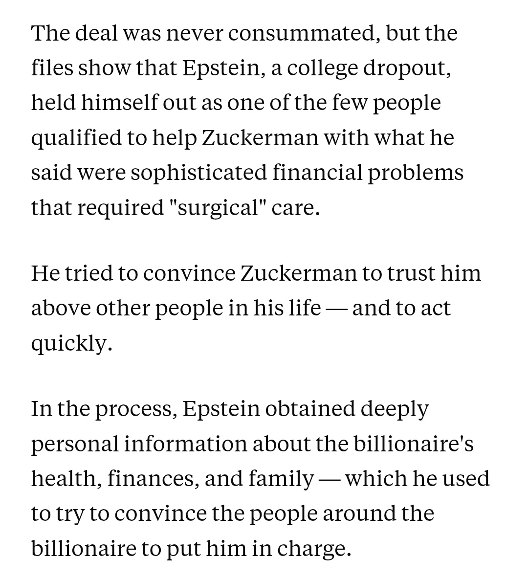 The deal was never consummated. But the emails between Epstein, Zuckerman, Zuckerman's family and executive assistant, and Terje Rod-Larsen — the Norwegian diplomat and friend of Epstein — shows how Epstein wormed his way into the financial lives of his friends.