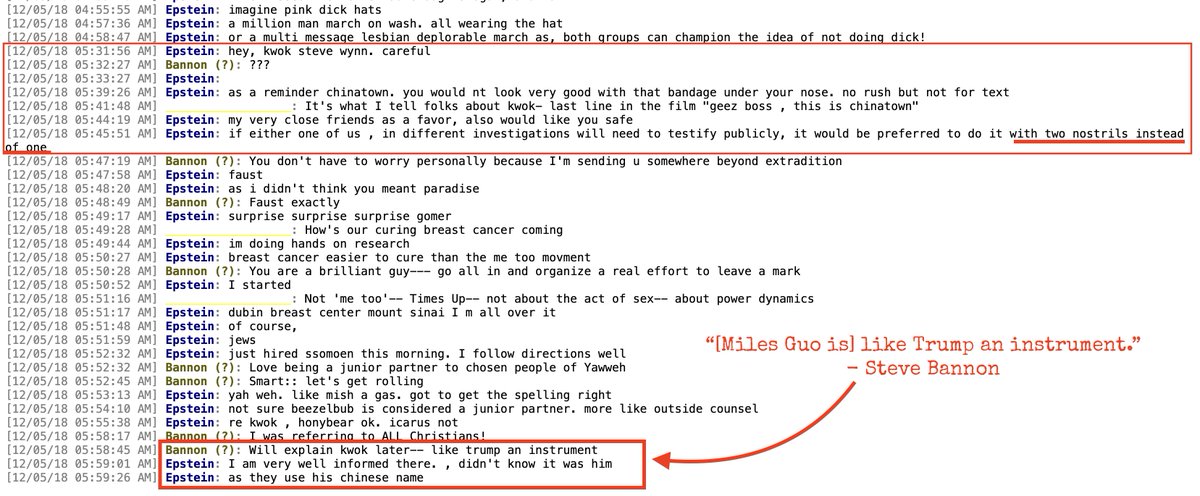 Epstein explaining to Bannon that chinese crypto grifter / intelligence operative Miles Guo is a very dangerous and violent man. The kind of man even Jeffrey Epstein is afraid of.