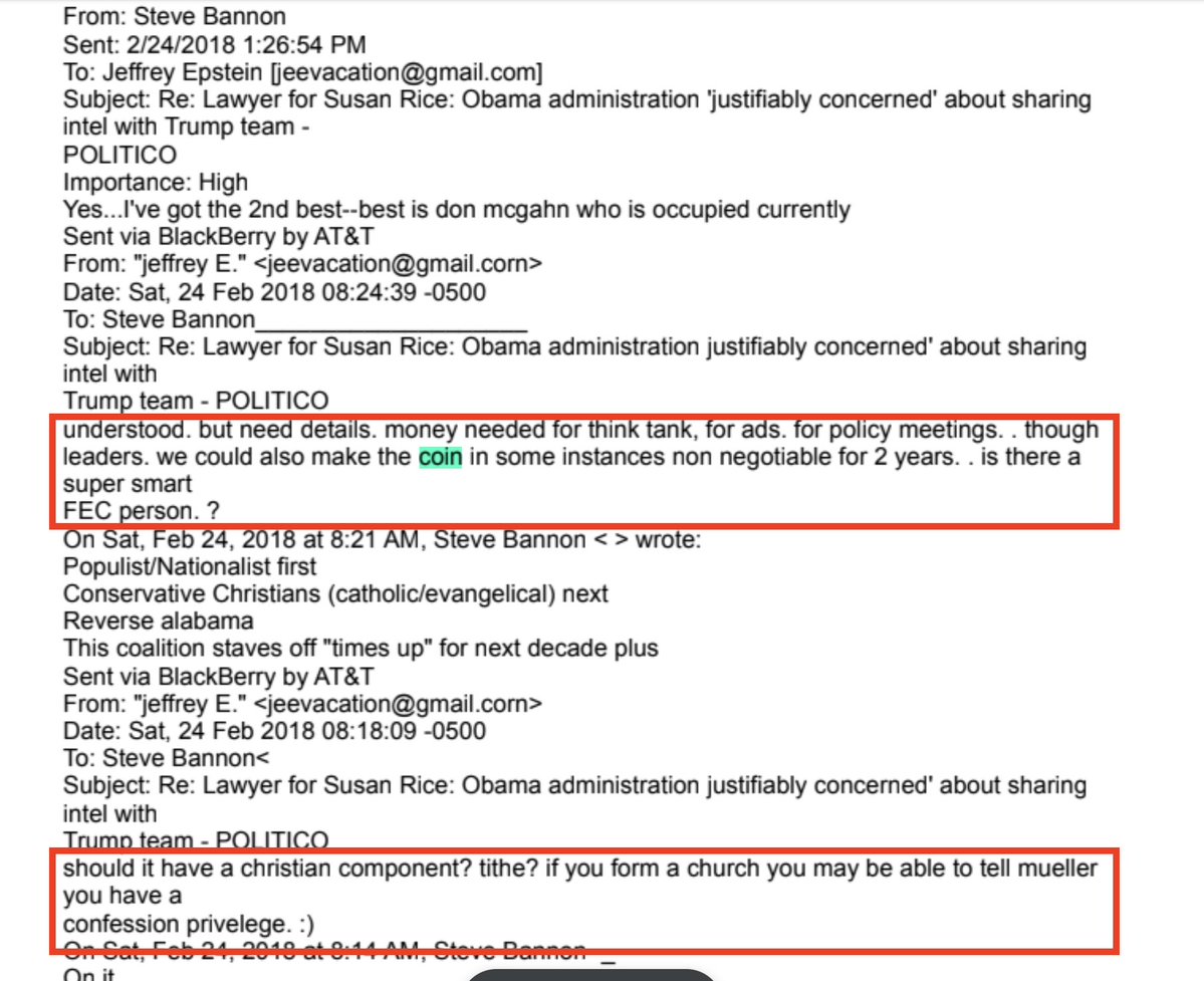 hard to be 100% sure but i'm like 98% sure this is a conversation between epstein and bannon about whether their coming crypto token will have "a christian component" and whether it should be "negotiable" (whatever that means)