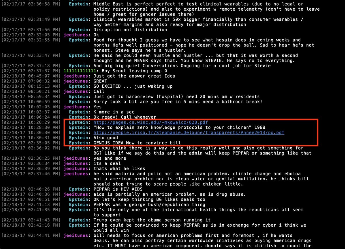 2017: Epstein sending a link to a "How to explain zero knowledge protocols to your children" PDF right before a meeting.