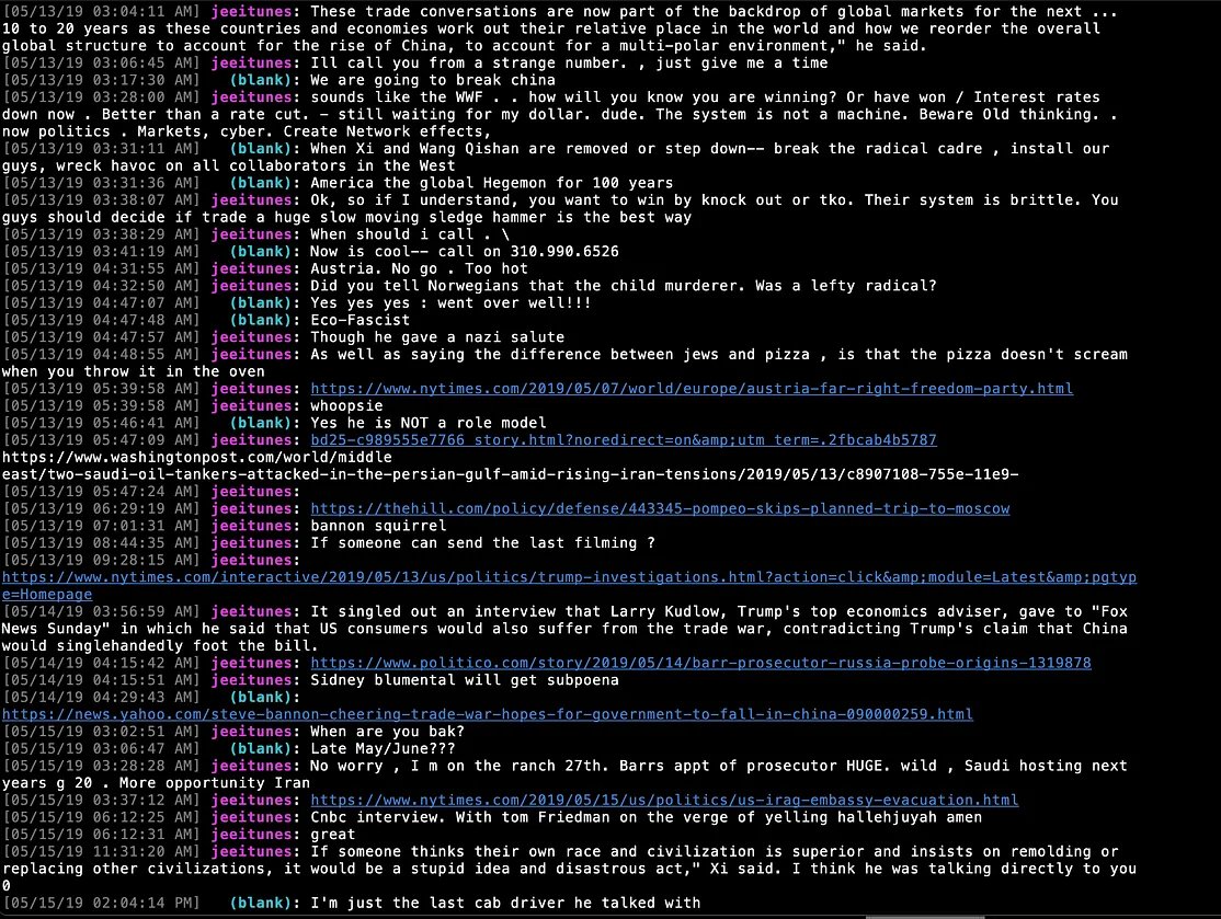 @ImDrinknWyn @intel_jakal @Scaramucci but it could def. be bannon in some of the messages. i went through a ton of the messages and it's definitely plausible that it's not always the same person.