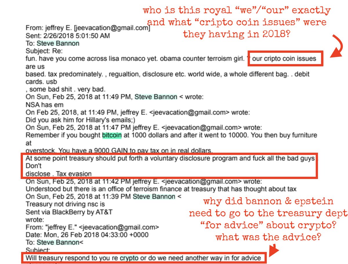 Epstein + Bannon discussing that they need to appeal to the US treasury dept for "advice" about "cripto coin issues" is thing in the emails that's haunting me.