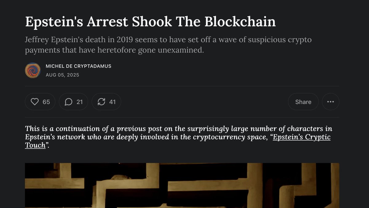 I will now take an intermission to point out that I wrote not one but two articles over on The Blogging Site That Shall Not Be Named about how Epstein was very obviously more connected to crypto's development than most people seem to understand. cryptadamus.substack.com/p/epsteins-arr…
