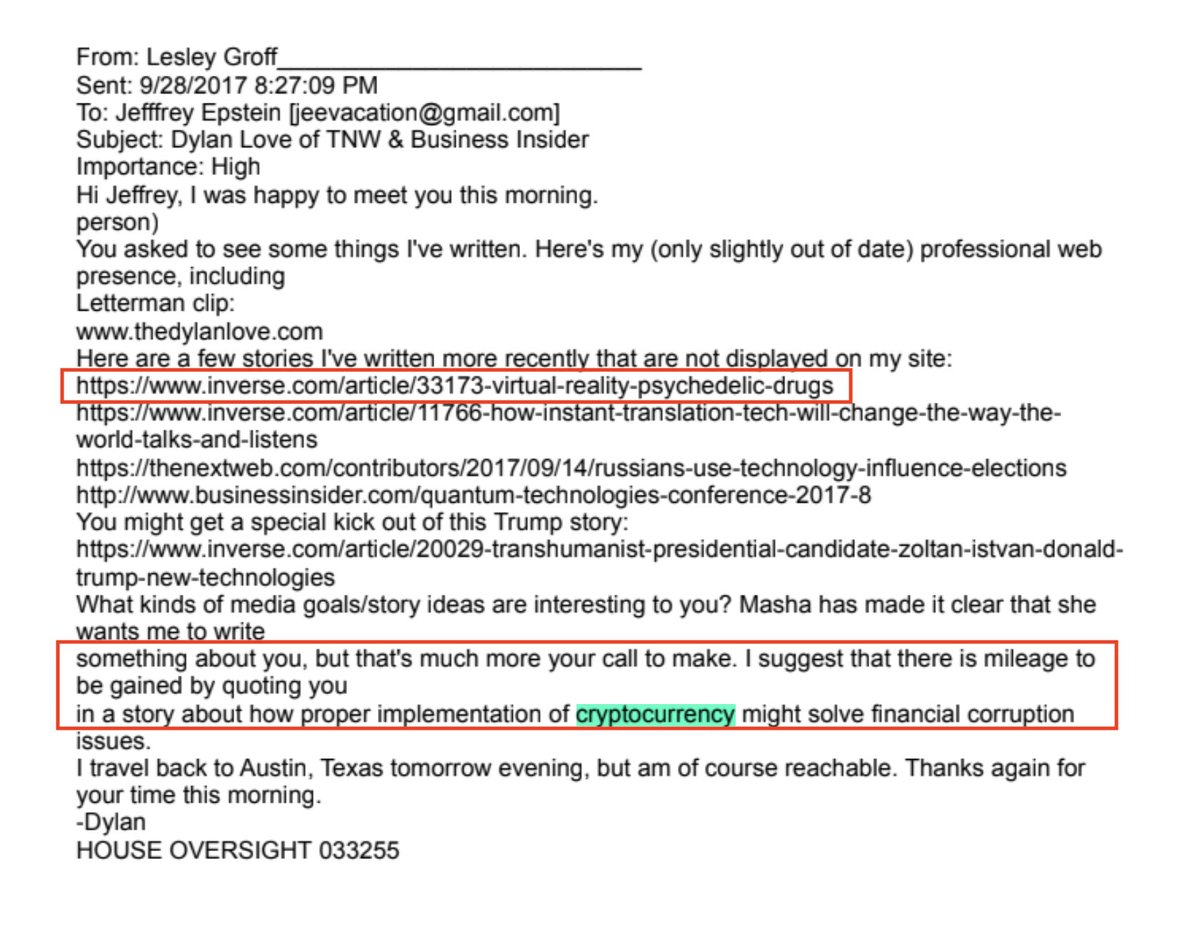 Journalist Lesley Groff warms up Epstein by explaining she writes articles about VR and psychedelic drugs and then suggests "there is mileage to be gained by quoting you in a story about how proper implementation of cryptocurrency might solve financial corruption issues.