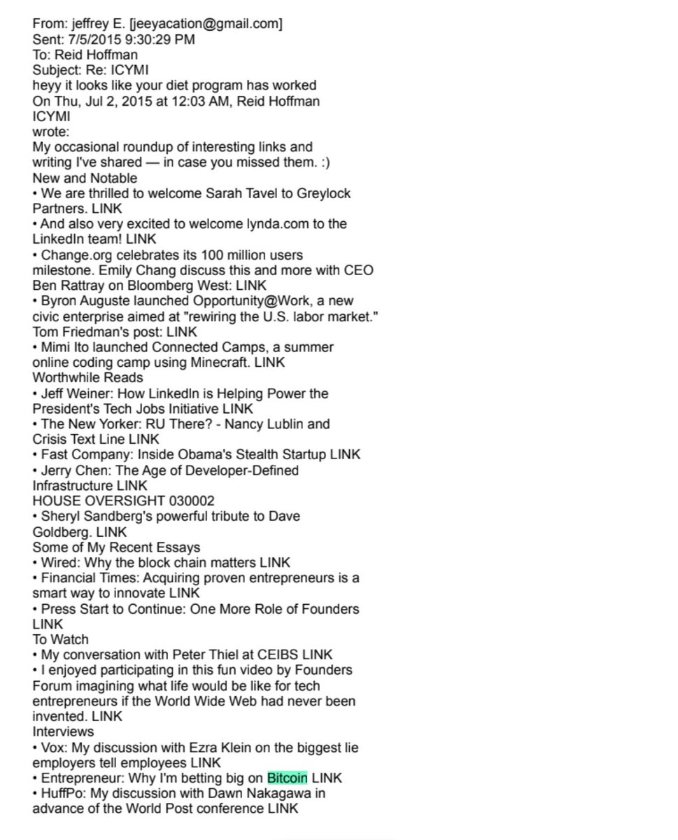In 2015 Reid Hoffman (LinkedIn) sent Epstein a collection of interesting articles including one titled "Why I'm betting big on Bitcoin"