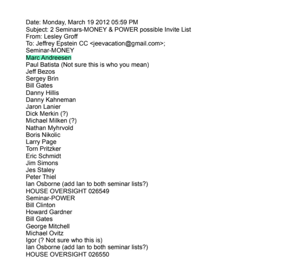 It's 2012 and Epstein seems to be dictating a guestlist for "2 seminars: MONEY and POWER". the attendees he's considering: