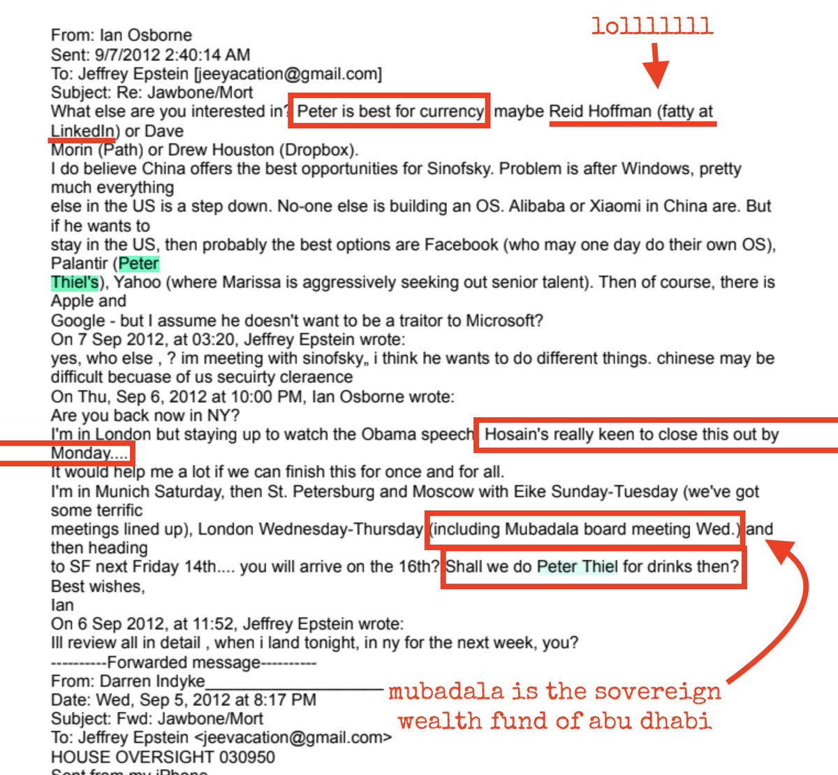 - Ian Osborne to Epstein in 2012 in an email that also mentions the sovereign wealth fund of Abu Dhabi and Epstein's potential investment in Jawbone (phone mic/earpiece co. I think)