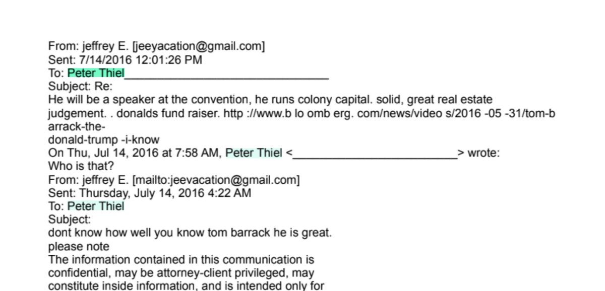 Epstein emailing Thiel directly 4 years later in 2016 talking about "donalds fund raiser (sic)", Colony Capital, and Tom Barrack.