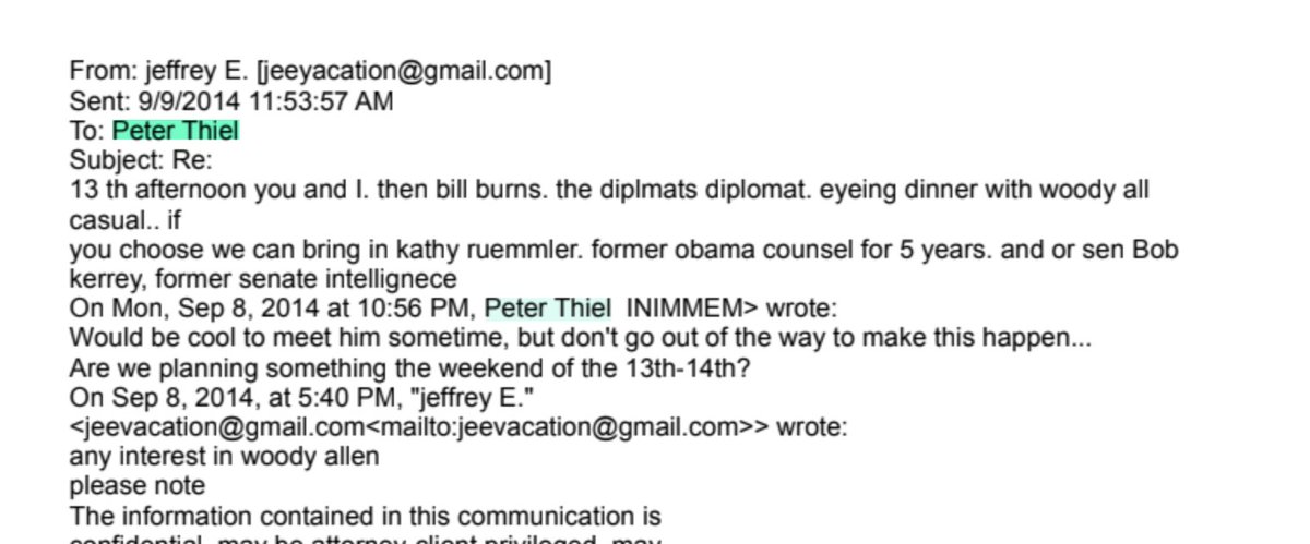 Sep 2014: Epstein inviting Thiel to meet Woody Allen in 2014.