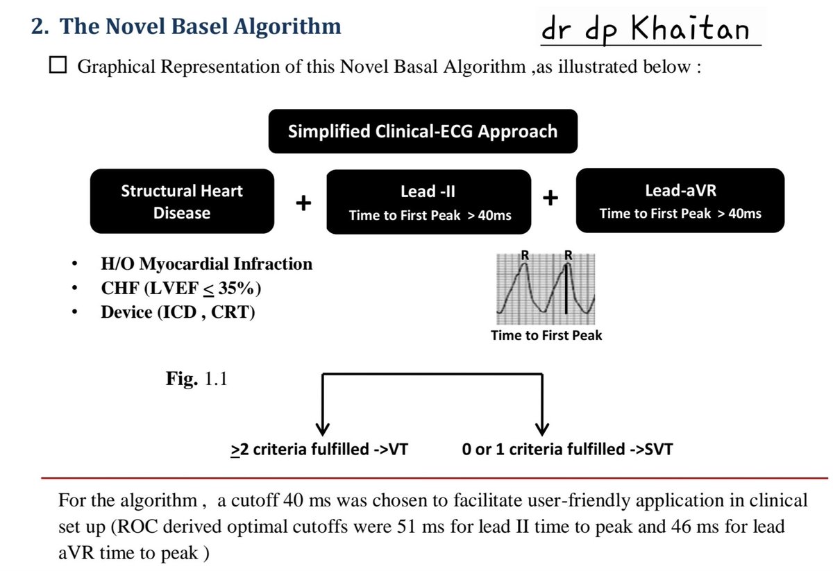 ▪️Basel algorithm (differential of wide complex tachycardia) , VT is diagnosed in the presence of at least 2 of the following criteria : 1) Structural Heart Disease ; 2) lead II time to first peak > 40 ms ; and 3) lead aVR time to first peak > 40 ms ; failing to which is the SVT.