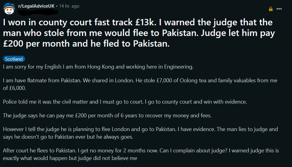 r/LegalAdviceUK is a reddit subreddit where people ask for legal advice about their problems. Because of the levels of dysfunction in Britain (AKA ‘The Yookay’) today they often read as parody. Here is a thread of some of the more absurd recent posts