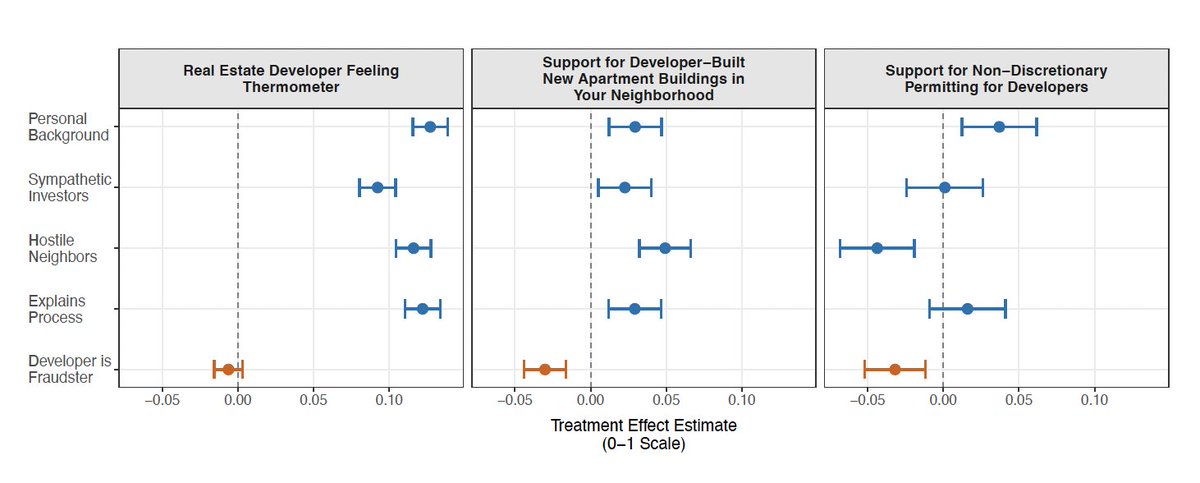 The news clip about the developer charged with fraud didn't reduce warmth toward developers (b/c people already think developers are fraudsters?), but it did reduce support for allowing developers to build apartments in one's neighborhood & for ministerial permitting.