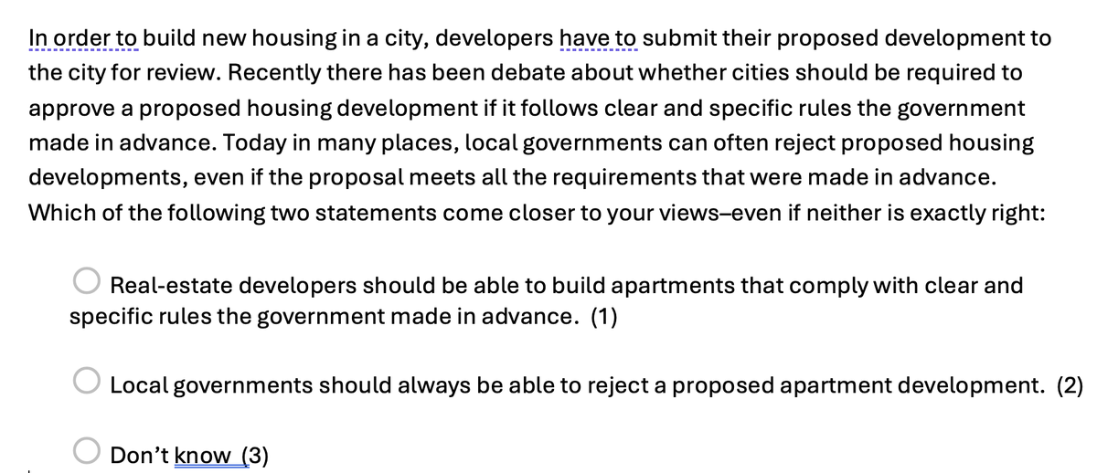 After watching the video, respondents answered two questions about support for housing policies in which developers are salient.