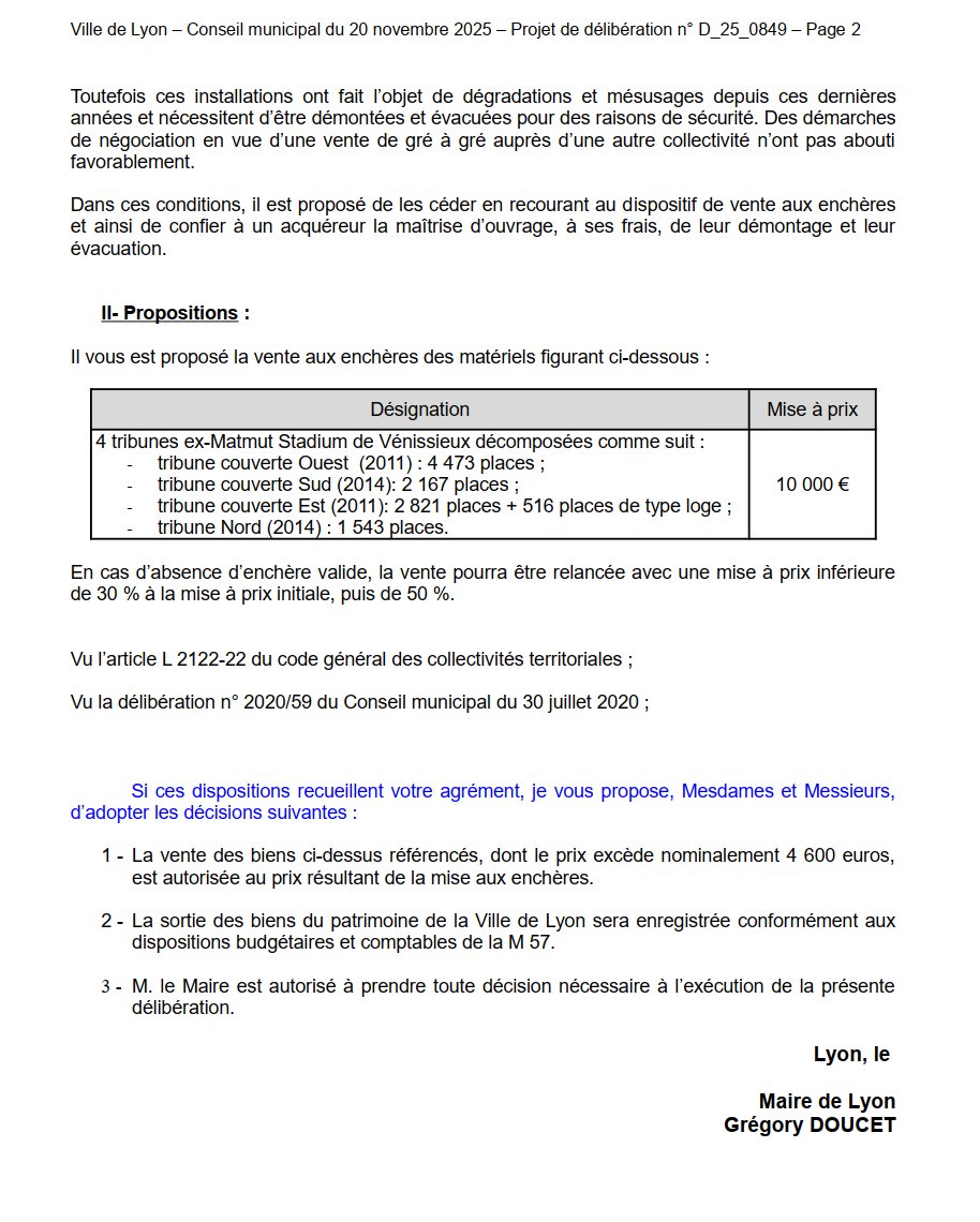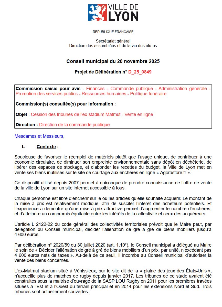 Le rapport de la CdC sur le LOU avait beaucoup fait parler lors du conseil municipal de septembre. La Ville trouve ici l'occasion de rentrer un peu d'argent grâce au rugby, en mettant aux enchères 4 tribunes du Matmut Stadium. Mise à prix : 10 K€. Image