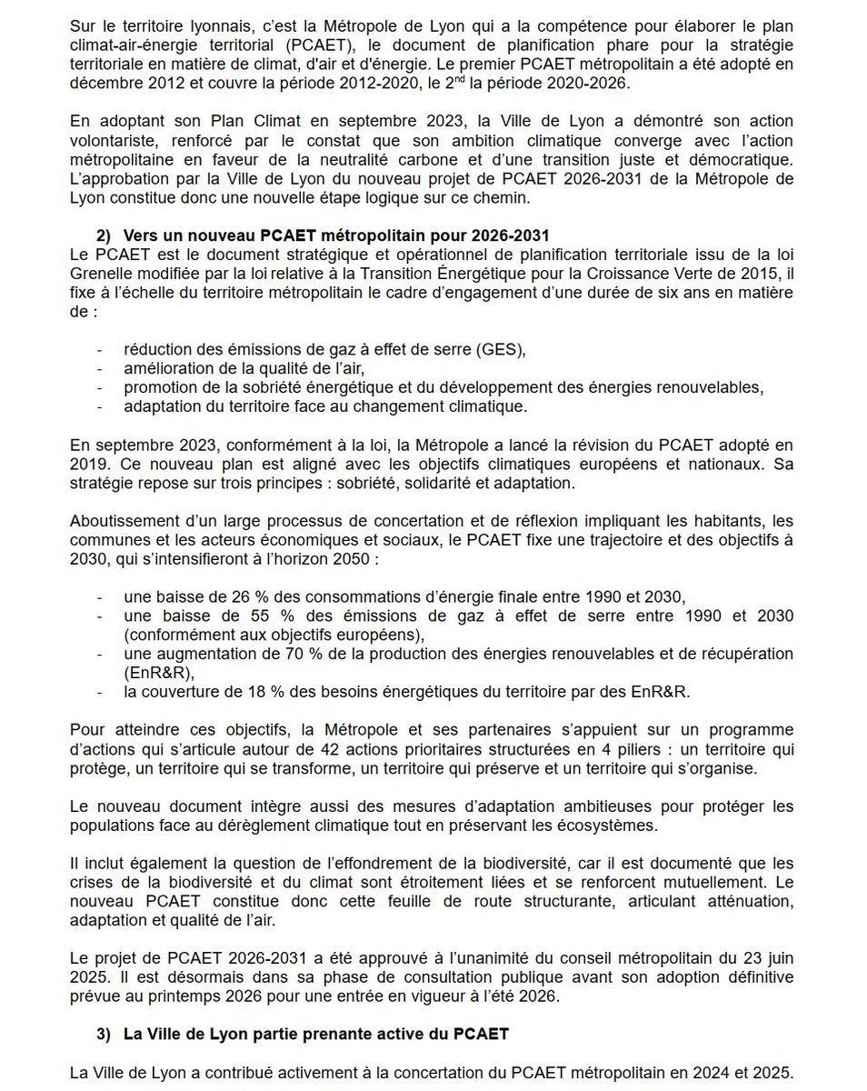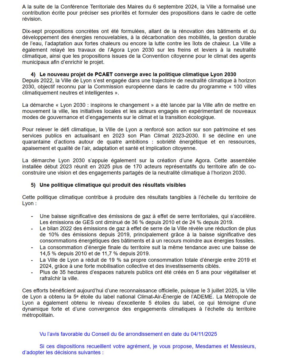 Dans la continuité, va être présenté le nouveau Plan climat-air-énergie territorial de la Métropole de Lyon pour 2026-2031. Au passage, la Ville rappelle son bilan depuis 2019 : - 19% de conso d'énergie, 35 ha végétalisés et des émissions de GES en baisse. Image