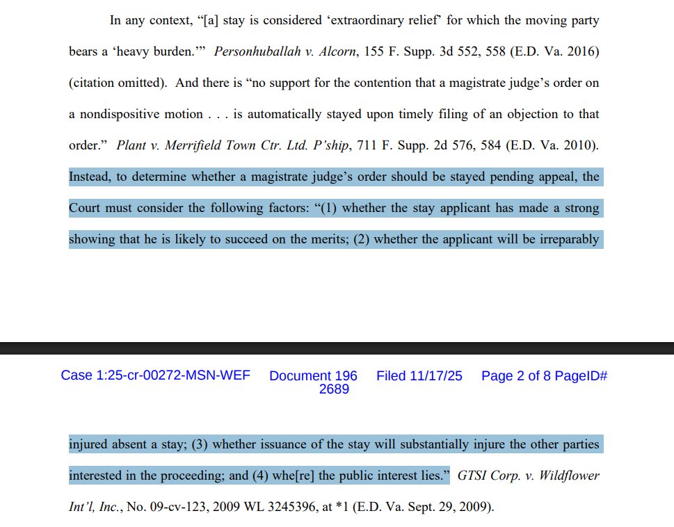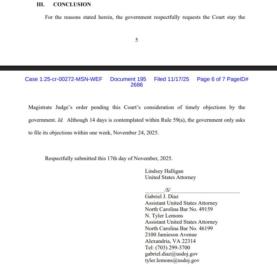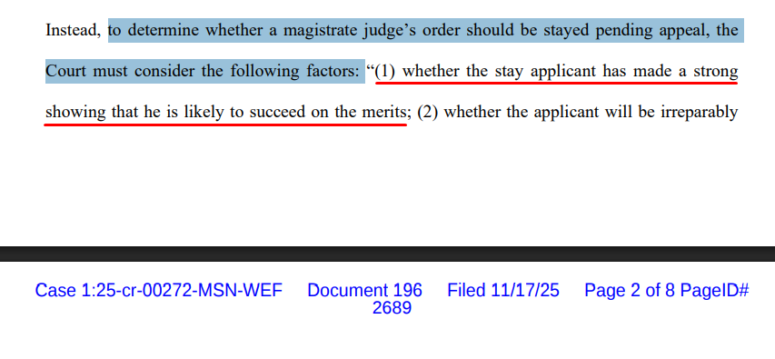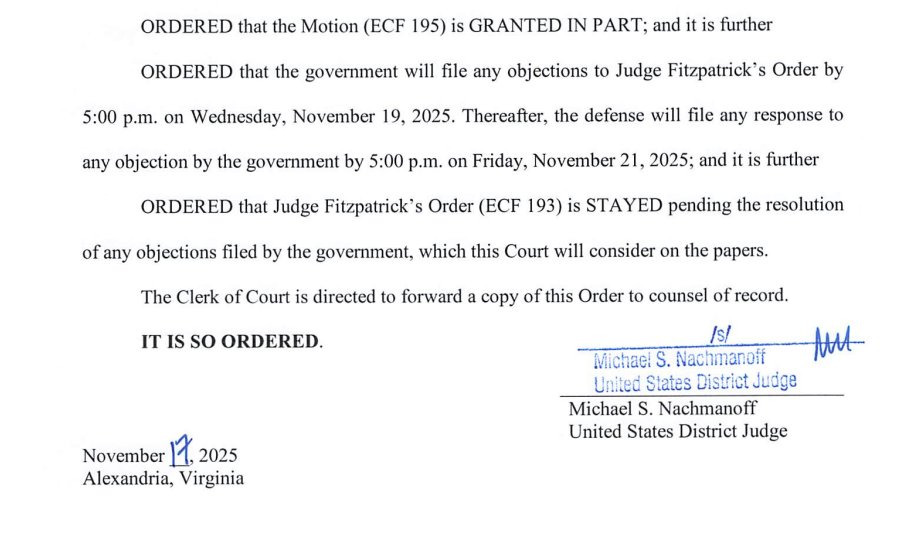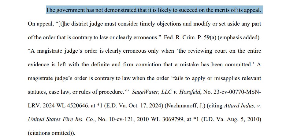 Prosecutors filed the emergency motion pursuant to Fed. R. Crim. Pro 59(a), which allows for a party before a magistrate judge to object to orders within 14 days. The district judge, who is Nachmanoff, must then consider the objection and "modify or set aside any part of the order that is contrary to law or clearly erroneous."