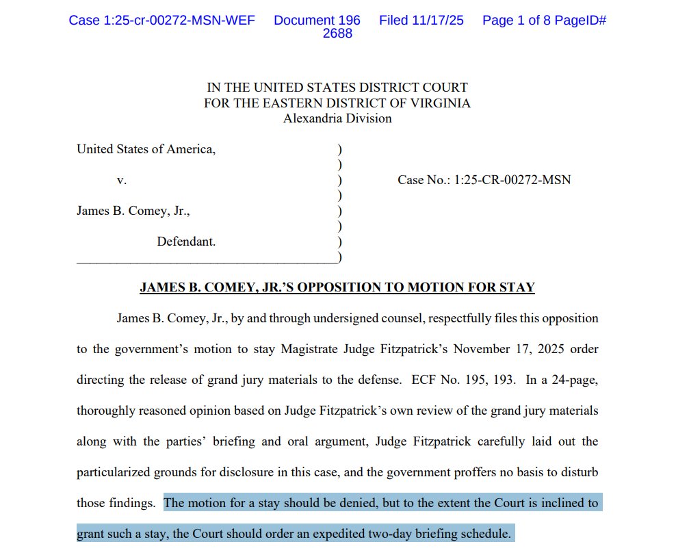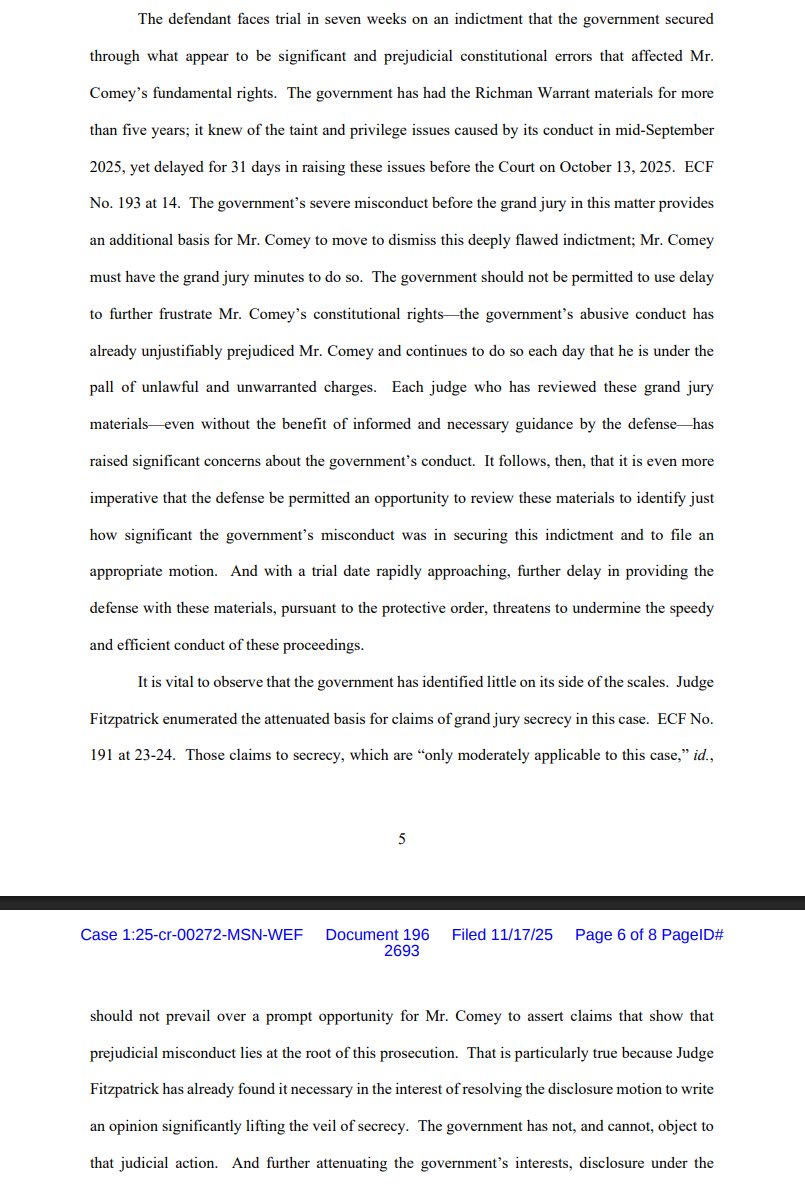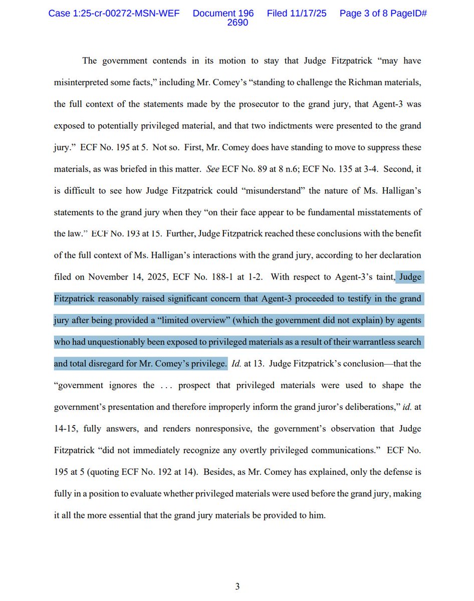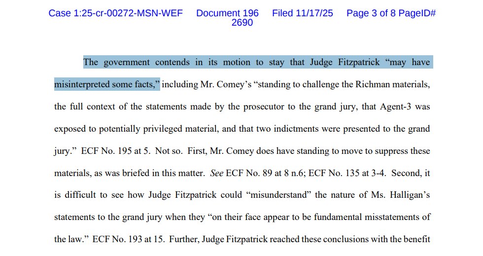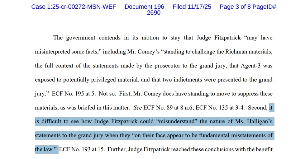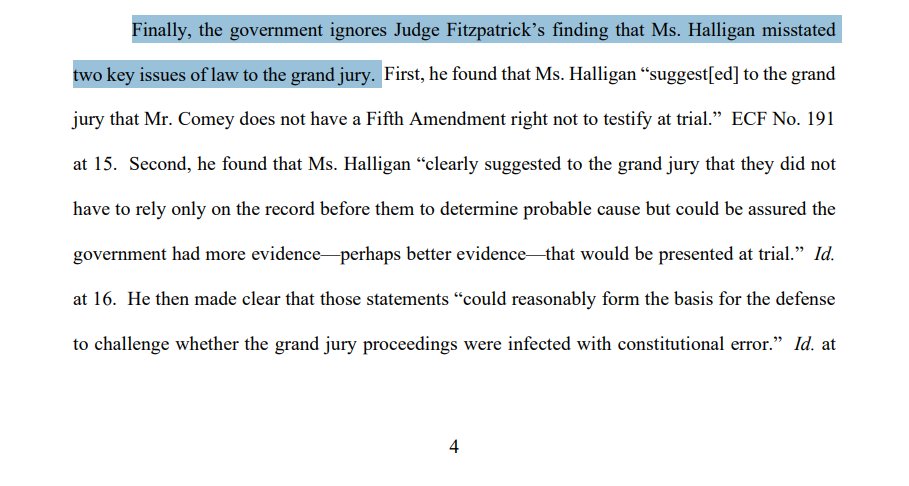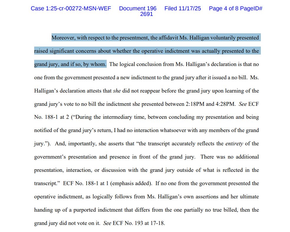 NEW filing by US Attorney Halligan clarifies that "the foreperson of the grand jury 'reported that 12 or more grand jurors did not concur in finding an indictment' as to proposed 'Count 1 only,'" but did concur on Counts 2 & 3.