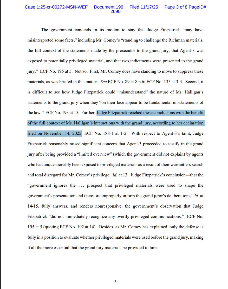 "Judge Fitzpatrick reached these conclusions with the benefit of the full context of Ms. Halligan’s interactions with the grand jury, according to her declaration filed on November 14, 2025"