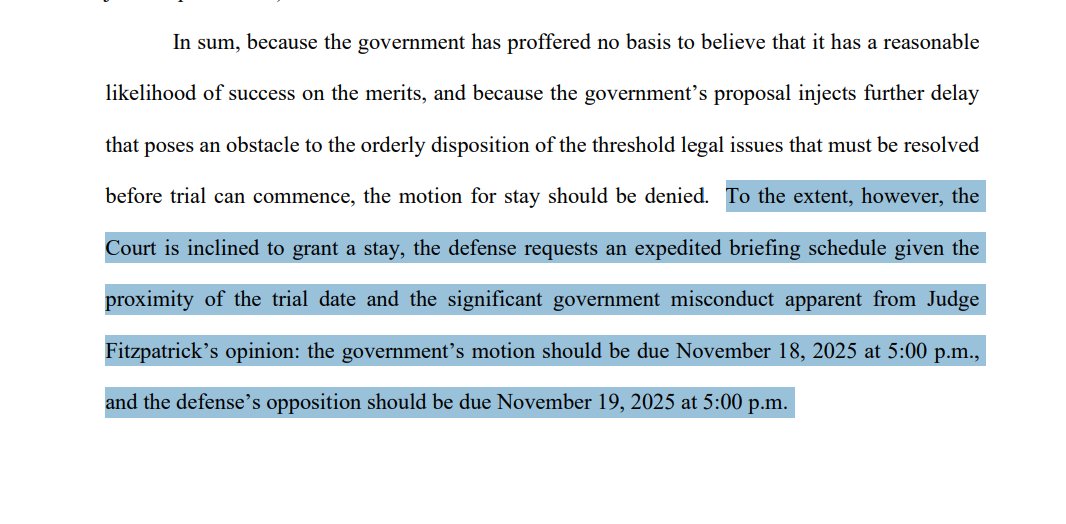"To the extent [] the Court is inclined to grant a stay, the defense requests an expedited briefing schedule given the proximity of the trial date and the significant government misconduct apparent from Judge Fitzpatrick’s opinion: the government’s motion should be due November 18, 2025 at 5:00 p.m., and the defense’s opposition should be due November 19, 2025 at 5:00 p.m."