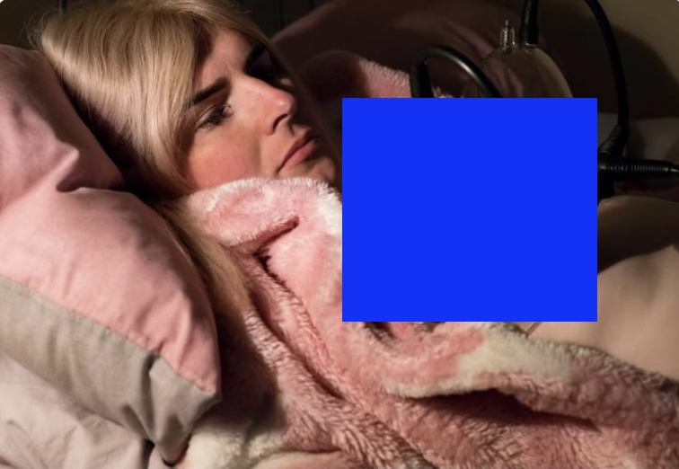 [NC takes her to an image as part of the exhibition - it is a man with his breasts are in a suction pump.]