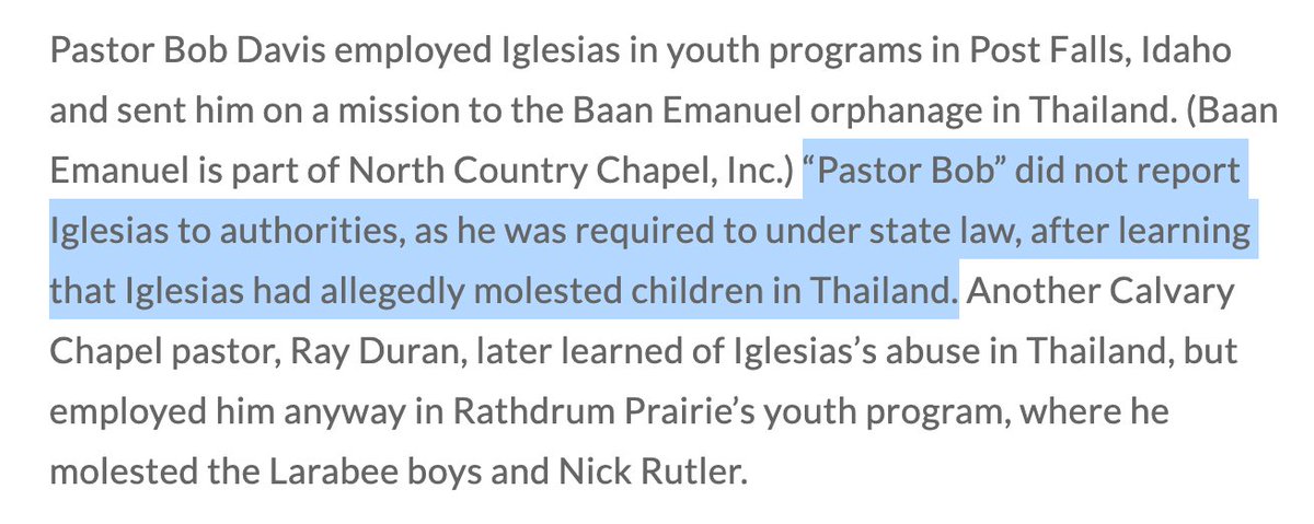 Pastor Bob Davis of North Country Chapel in Post Falls, Idaho was the one who brought my father Paul Van Noy to Coeur D’Alene. Davis failed to report his youth pastor Anthony L. Iglesias to authorities after learning Iglesias allegedly m𝐨lested children in Thailand. Davis was legally required to report the abuse, but his inaction allowed the abuser to continue in ministry. /2