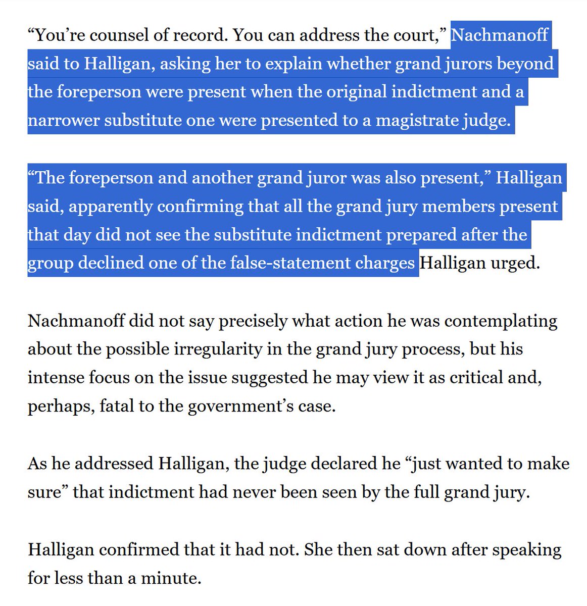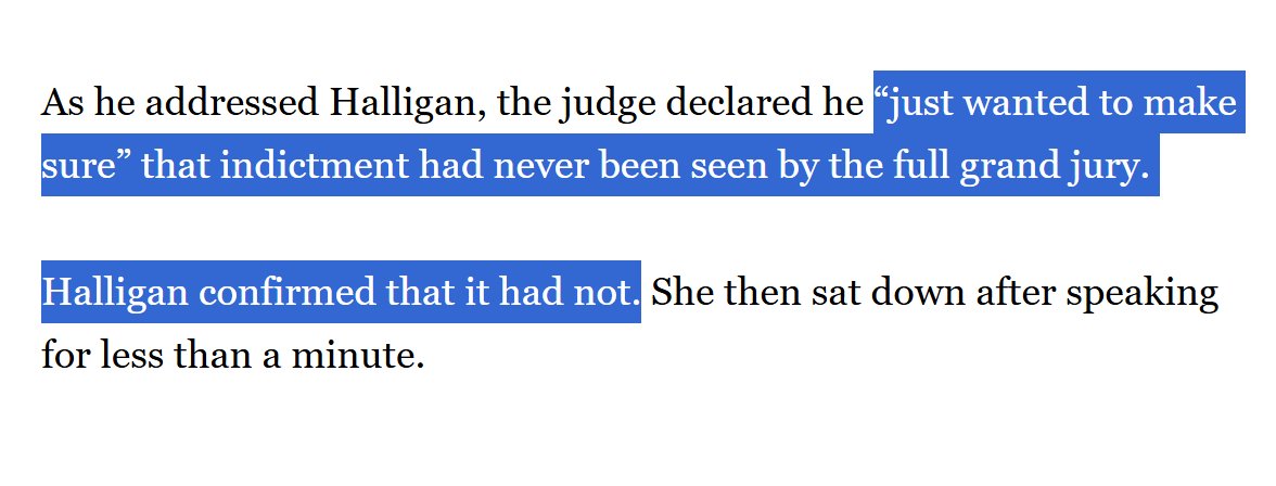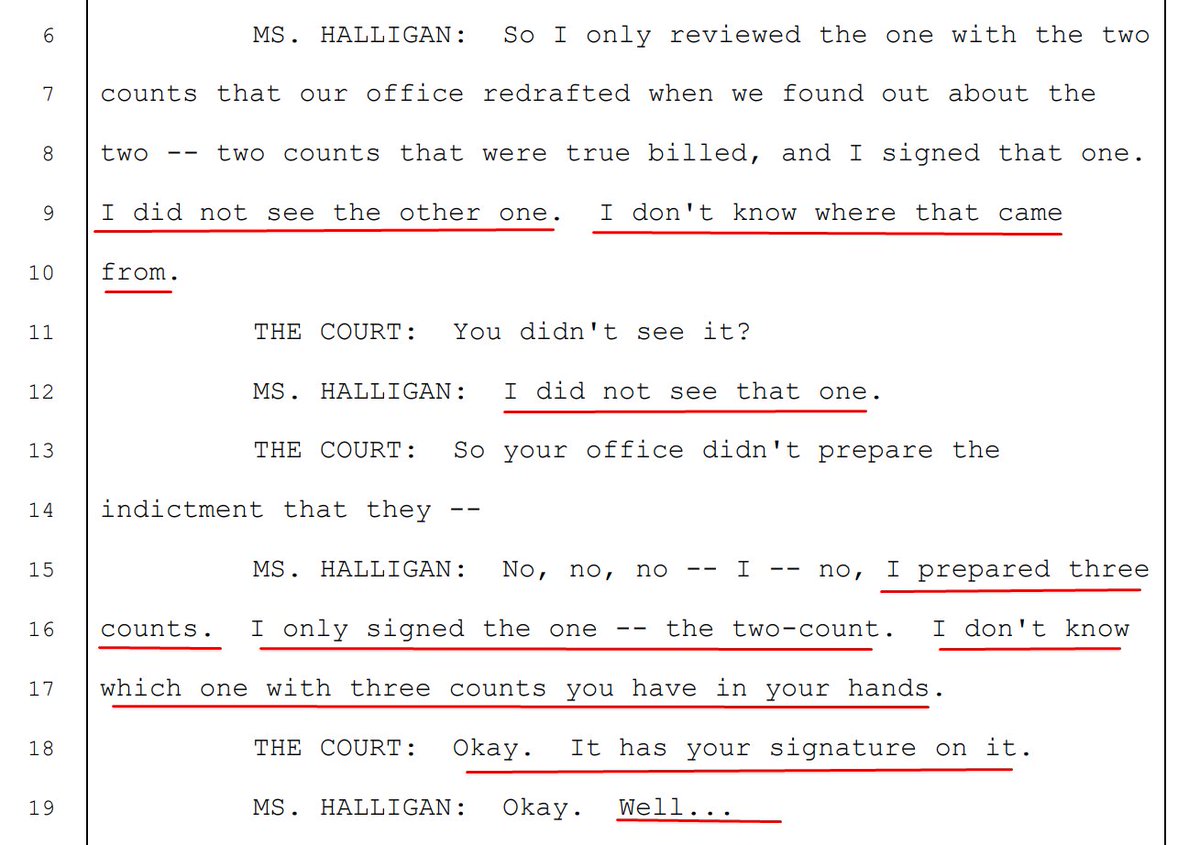 Reporting from the courtroom was that Halligan confirmed that the full grand jury DID NOT see the 2-count version of the indictment, which is now the charging instrument in this case.