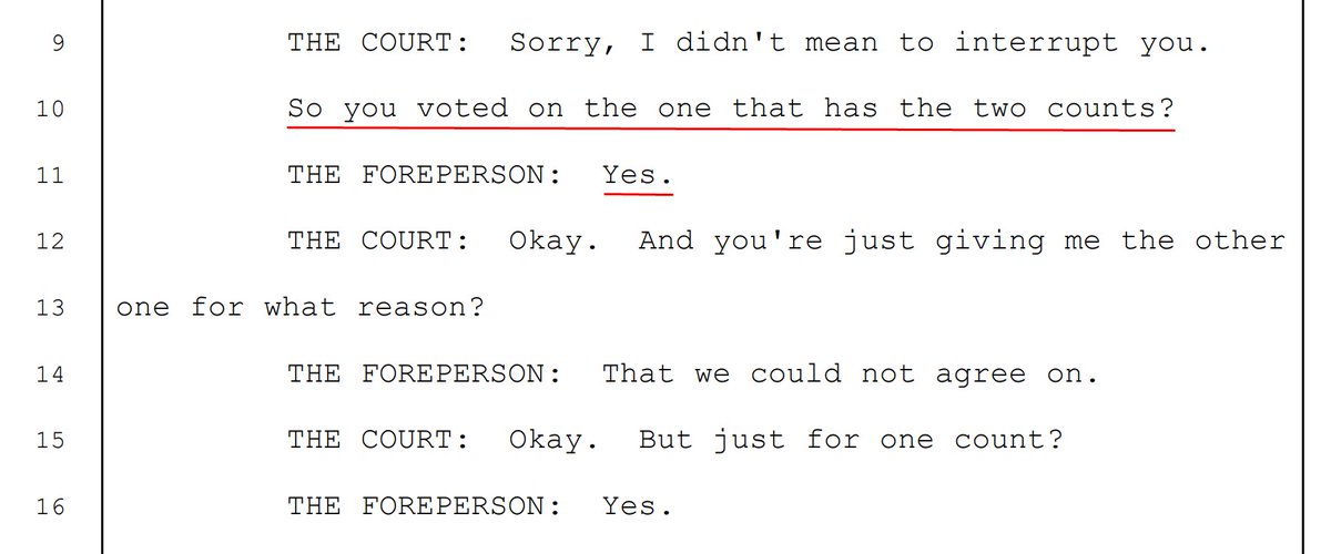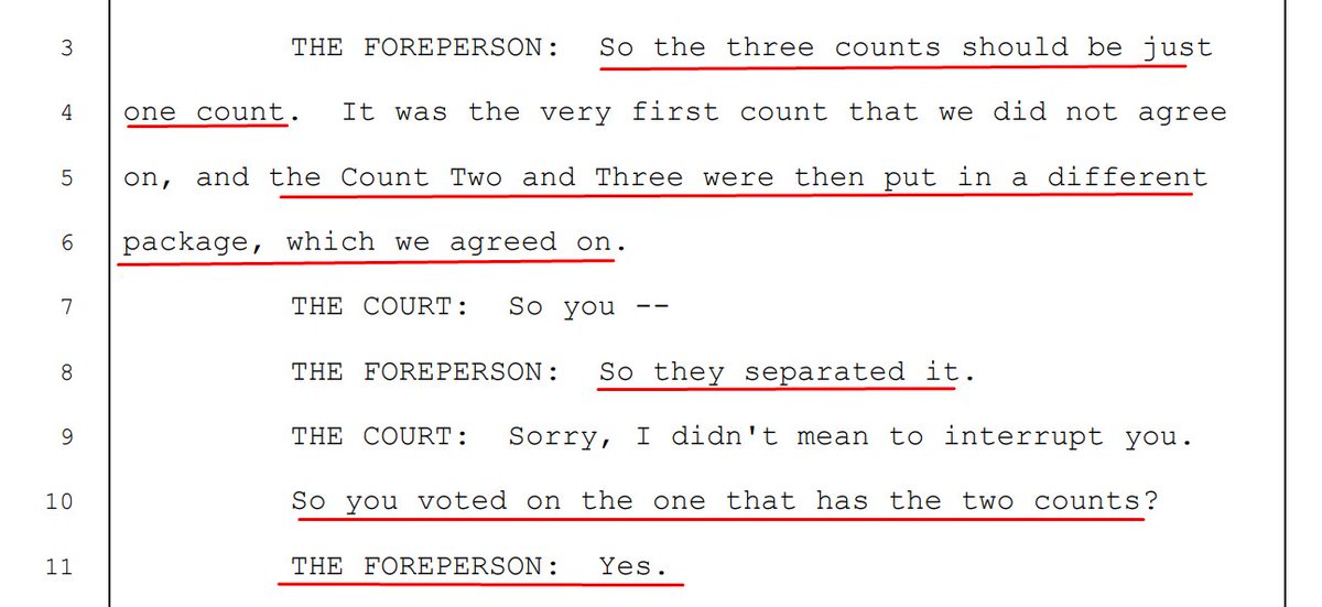 Foreperson: "So the three counts should be just one count. It was the very first count that we did not agree on, and the Count Two and Three were then put in a different package, which we agreed on."