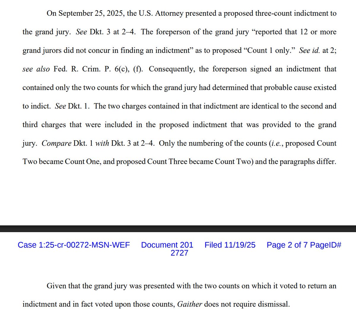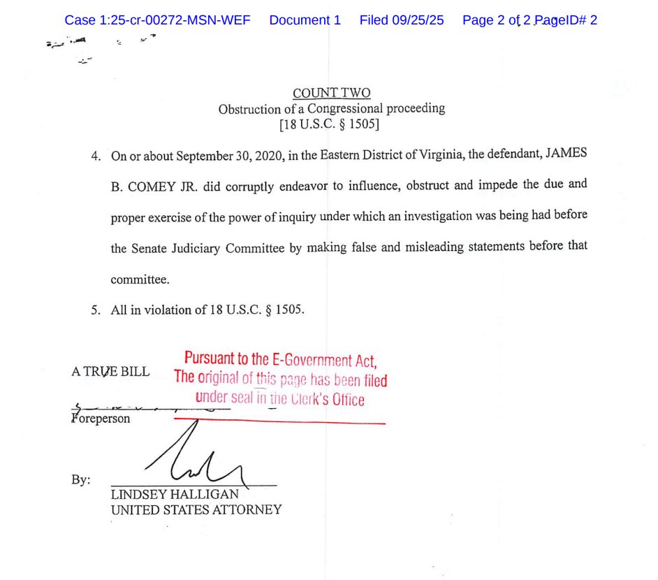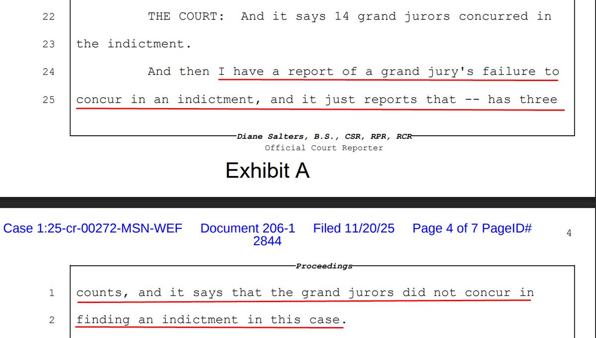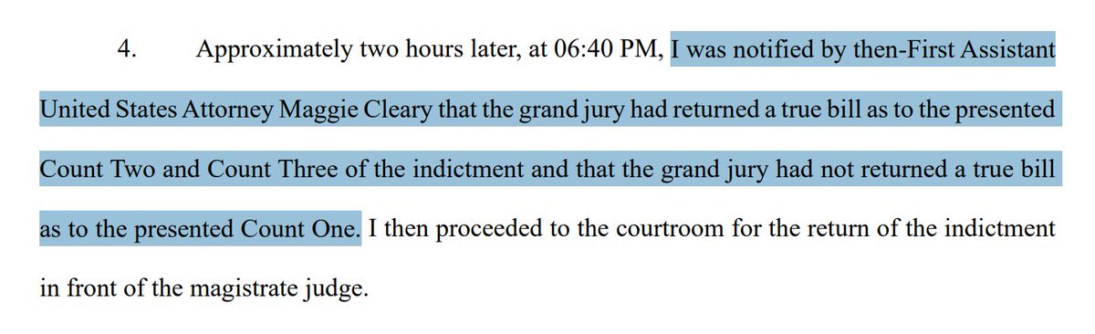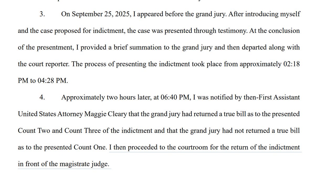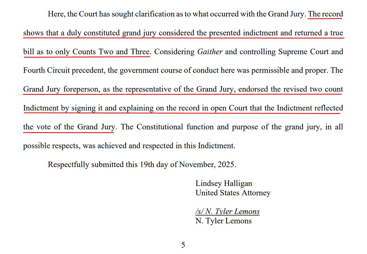 NEW filing by US Attorney Halligan clarifies that "the foreperson of the grand jury 'reported that 12 or more grand jurors did not concur in finding an indictment' as to proposed 'Count 1 only,'" but did concur on Counts 2 & 3.
