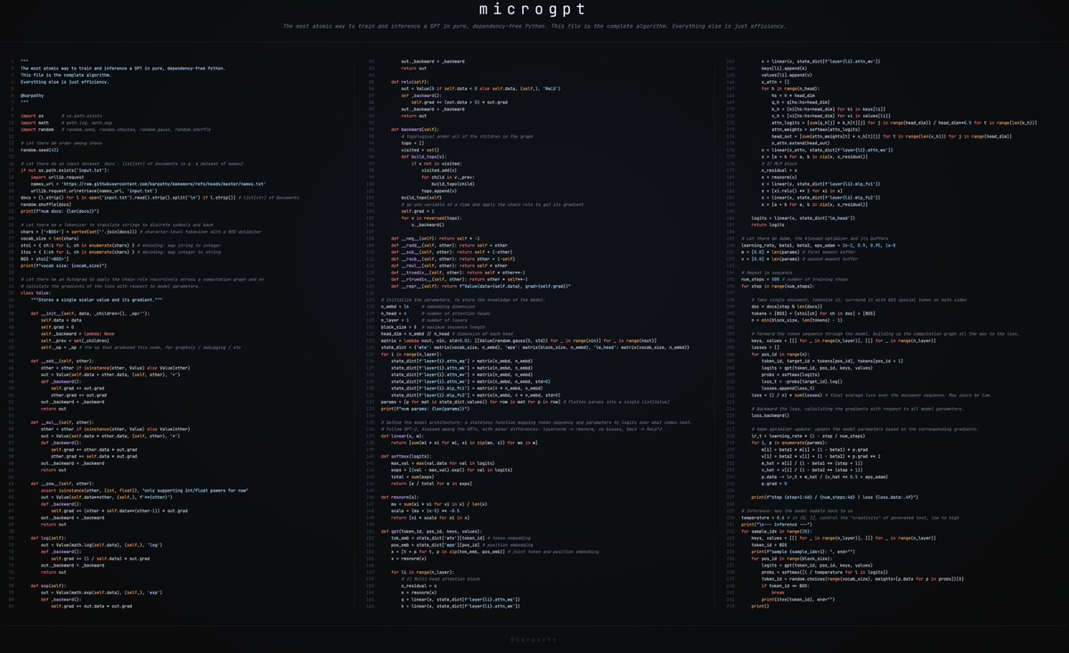 The way it works is that the full LLM architecture and loss function is stripped entirely to the most atomic individual mathematical operations that make it up (+, *, **, log, exp), and then a tiny scalar-valued autograd engine (micrograd) calculates gradients. Adam for optim.