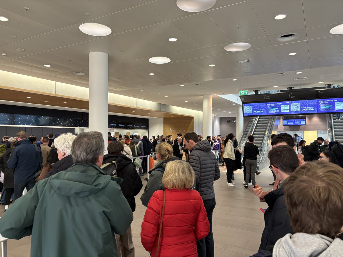 Drukte in de hal. Zoals gezegd: een Nederlands-Duitse partij dus op deze locatie grote kans op hoge opkomst. Was bv eerder al eens in Parijs, Lissabon en Boekarest, maar daar zijn nauwelijks Volt-leden.