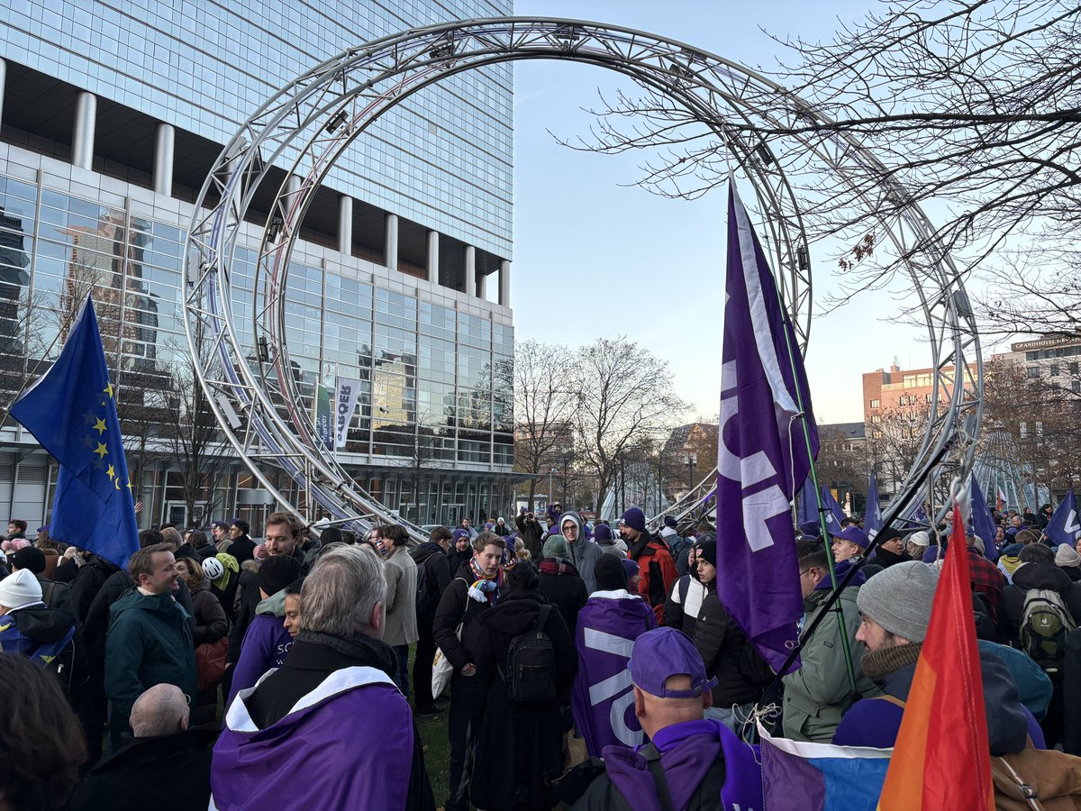 Er komt nu dus een demonstratie aan. We staan buiten. Super koud hier.