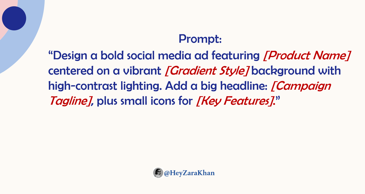 “Design a bold social media ad featuring [Product Name] centered on a vibrant [Gradient Style] background with high-contrast lighting. Add a big headline: [Campaign Tagline], plus small icons for [Key Features].”Image