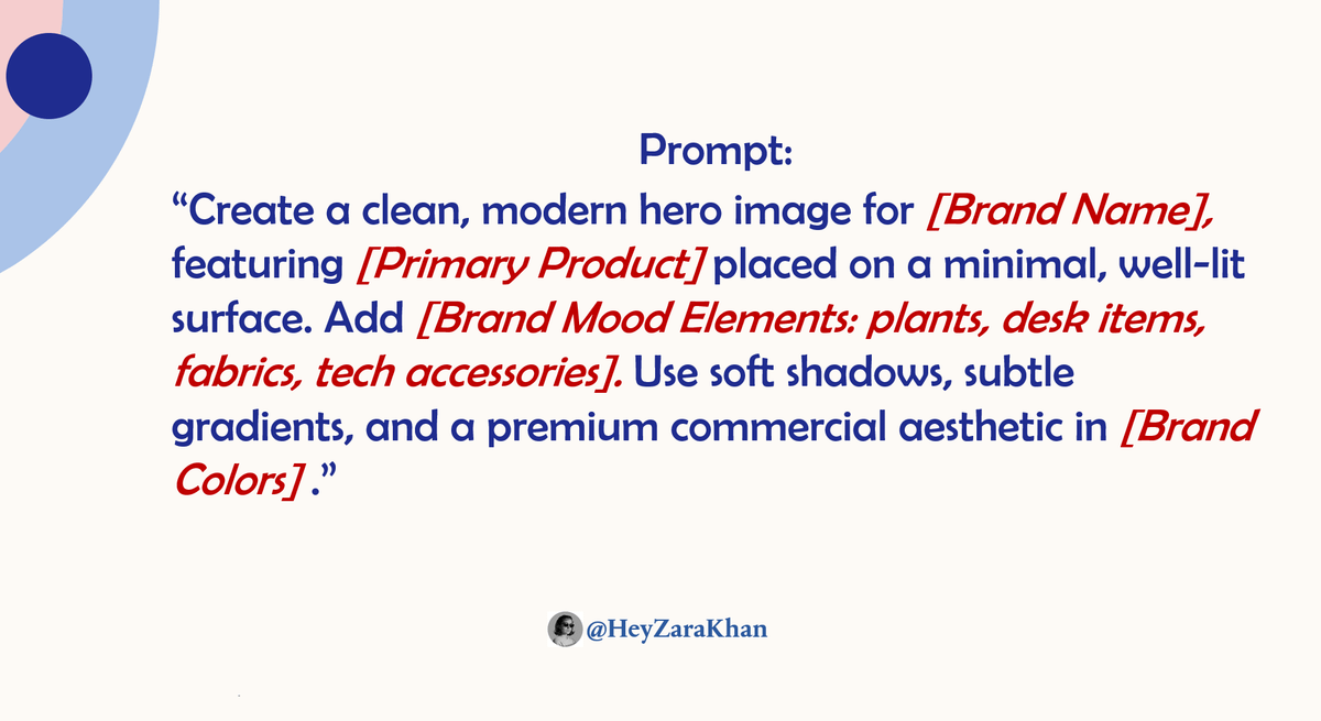 “Create a clean, modern hero image for [Brand Name], featuring [Primary Product] placed on a minimal, well-lit surface. Add [Brand Mood Elements: plants, desk items, fabrics, tech accessories]. Use soft shadows, subtle gradients, and a premium commercial aesthetic in [Brand Colors].”Image