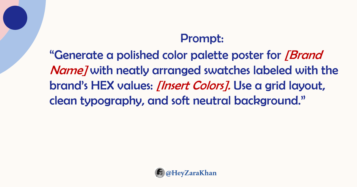 “Generate a polished color palette poster for [Brand Name] with neatly arranged swatches labeled with the brand’s HEX values: [Insert Colors]. Use a grid layout, clean typography, and soft neutral background.”Image