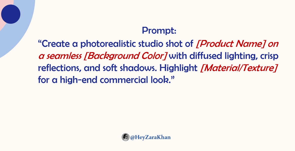 “Create a photorealistic studio shot of [Product Name] on a seamless [Background Color] with diffused lighting, crisp reflections, and soft shadows. Highlight [Material/Texture] for a high-end commercial look.”Image
