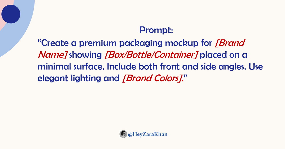 “Create a premium packaging mockup for [Brand Name] showing [Box/Bottle/Container] placed on a minimal surface. Include both front and side angles. Use elegant lighting and [Brand Colors].”Image
