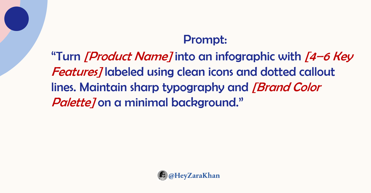 “Turn [Product Name] into an infographic with [4–6 Key Features] labeled using clean icons and dotted callout lines. Maintain sharp typography and [Brand Color Palette] on a minimal background.”Image