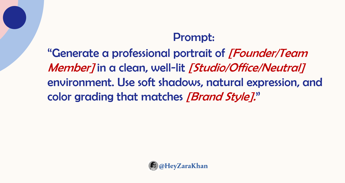 “Generate a professional portrait of [Founder/Team Member] in a clean, well-lit [Studio/Office/Neutral] environment. Use soft shadows, natural expression, and color grading that matches [Brand Style].”Image