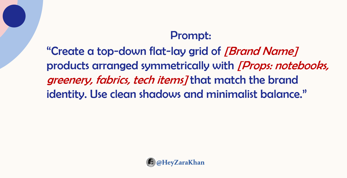 “Create a top-down flat-lay grid of [Brand Name] products arranged symmetrically with [Props: notebooks, greenery, fabrics, tech items] that match the brand identity. Use clean shadows and minimalist balance.”Image
