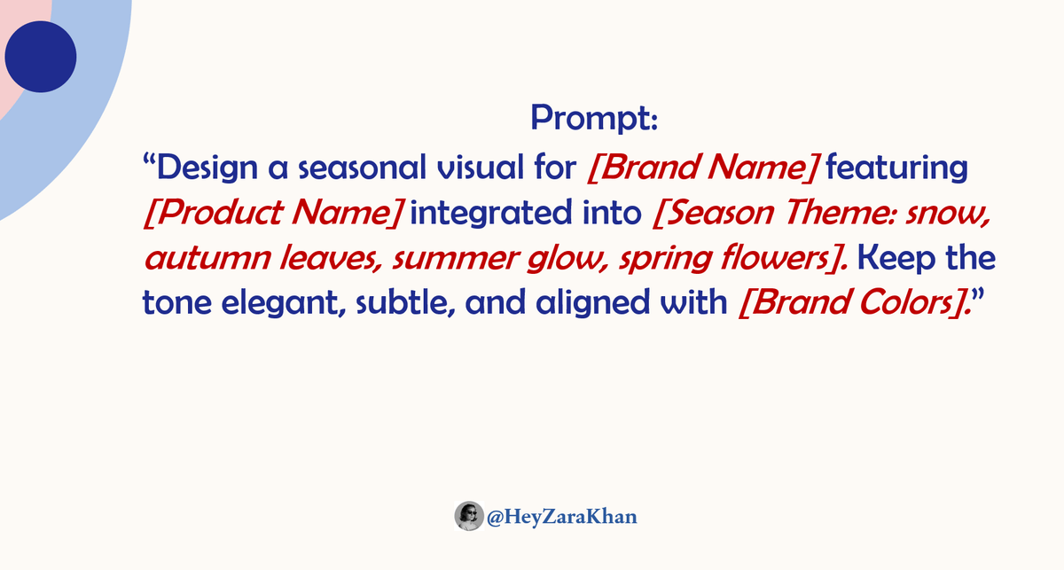 “Design a seasonal visual for [Brand Name] featuring [Product Name] integrated into [Season Theme: snow, autumn leaves, summer glow, spring flowers]. Keep the tone elegant, subtle, and aligned with [Brand Colors].”Image