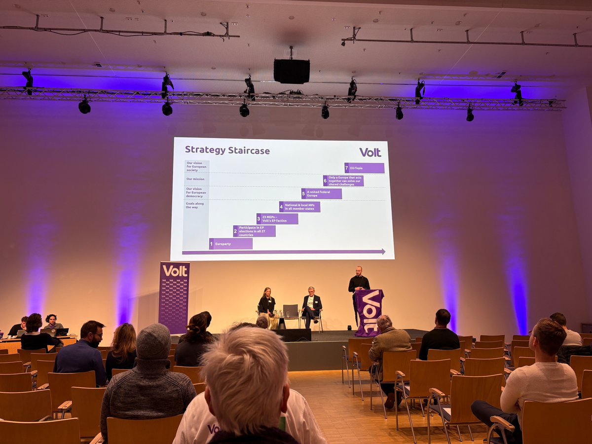 In de zaal. Hooguit 50 mensen. Vooral Duitsers. Nu komt het interessantste deel van het hele weekend - rare tijd voor zoiets - namelijk: wat gaat Volt doen de komende vijf jaar?