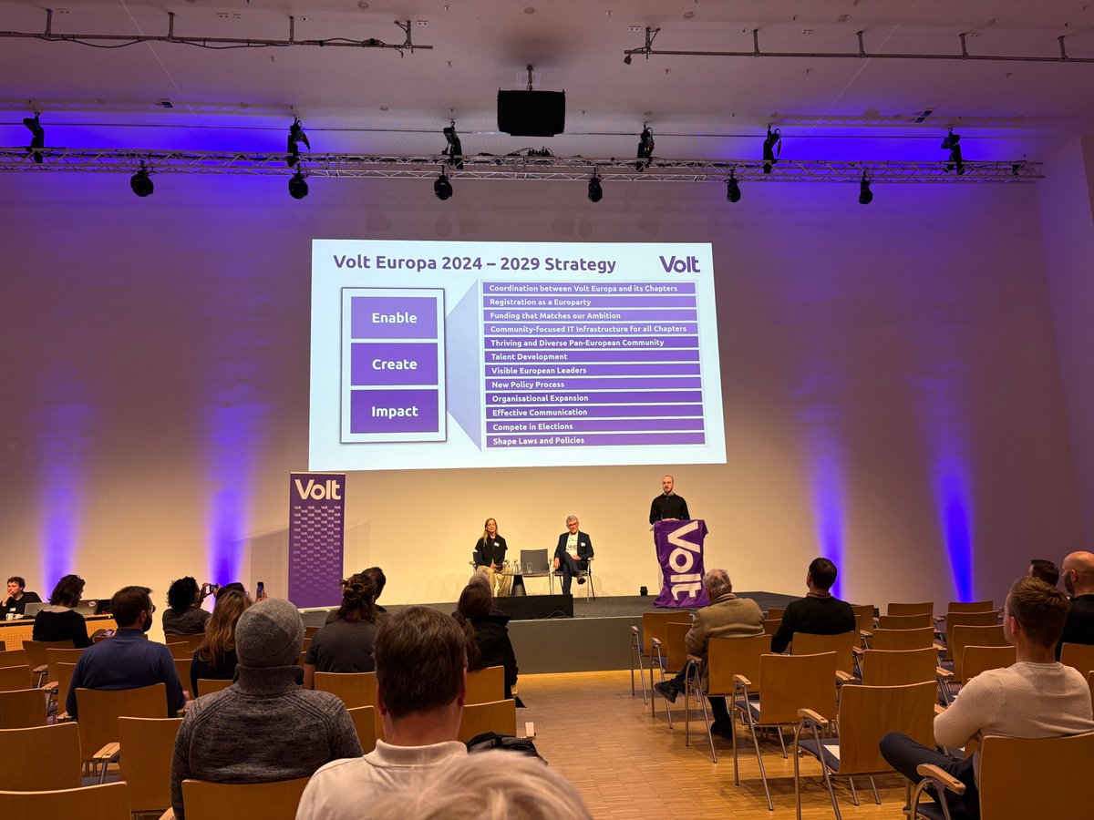 Dit onderdeel heet 'Shine 29 - Our plan for success (Strategy updated)'. Dit is de strategie van Volt om verkiezingen te winnen en veel impact te maken, zegt een langharige meneer op het podium.
