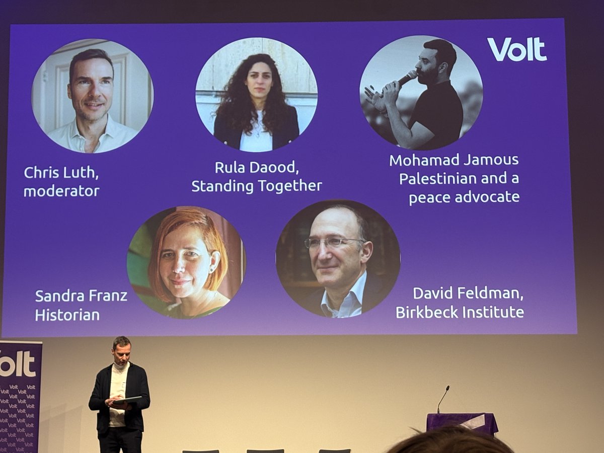 Nu een panel over hoe we dialoog kunnen voeren over Israël en Palestina terwijl Volt tegelijk een safe space moet blijven. De moderator benadrukt dat het geen debat is, maar een dialoog. Het gaat om wederzijds begrip. Applaus.