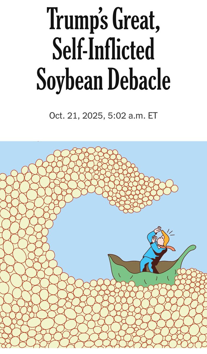Three years ago, American farmers were getting $16 a bushel for soybeans. Today, they’re getting $10. China is the world’s largest consumer of soybeans. In 2024, China purchased 52% of the soybeans grown in America. Now, China purchases none from the U.S. and instead . . .
