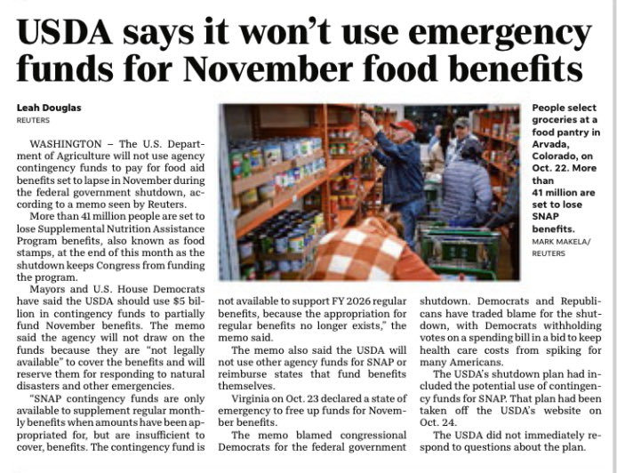 Trump’s Department of Agriculture says it won’t use emergency funds for SNAP benefits, so 42 million low income Americans won’t get nutritional assistance in November. Millions of children, elderly and disabled people, and Veterans will go hungry as a result.