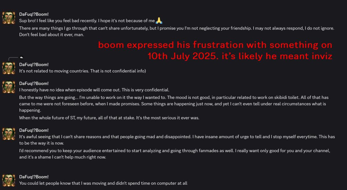 The YouTuber DaFuqBoom has lost creative control over skibidi toilet and his youtube channel by the company: Invisible Narratives. He was sent threats about his payments, upload schedule and a very strict NDA. Invisible are the ones who actually probably striked garry's mod